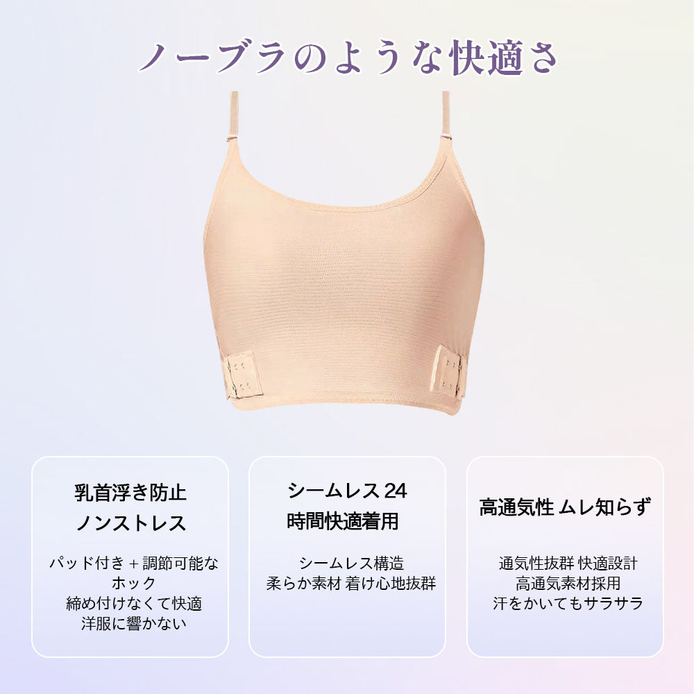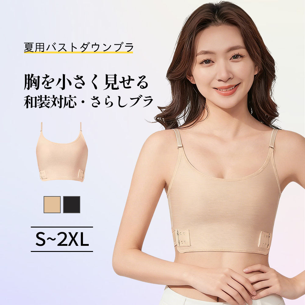 商品詳細:和装さらしブラ。バストラインをなだらかに整え、胸をすっきりコンパクトに見せます。脇高設計で脇まわりを引き締め、ラインをきれいにキープ。通気性に優れ、夏でもムレにくく快適です。伸縮性も高く、長時間の着用でもラクな着け心地。バストのふくらみをやさしく抑え、自然なシルエットへ導きます。