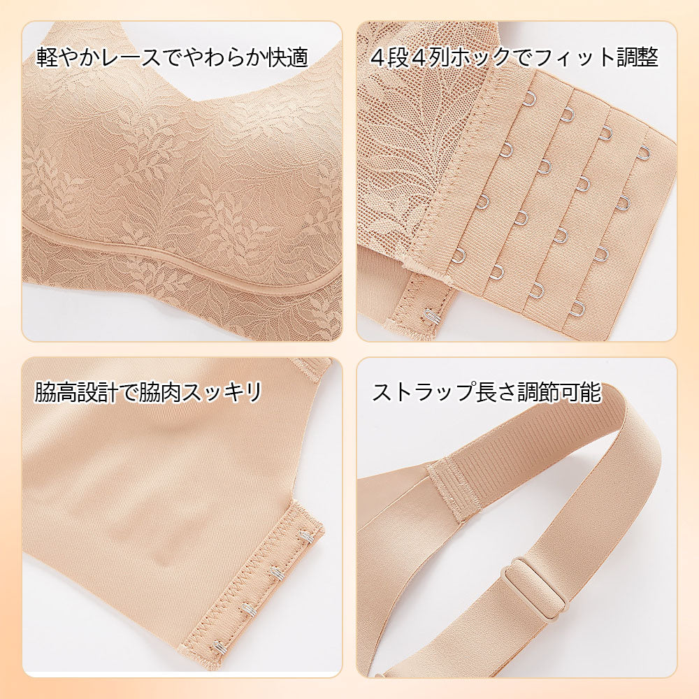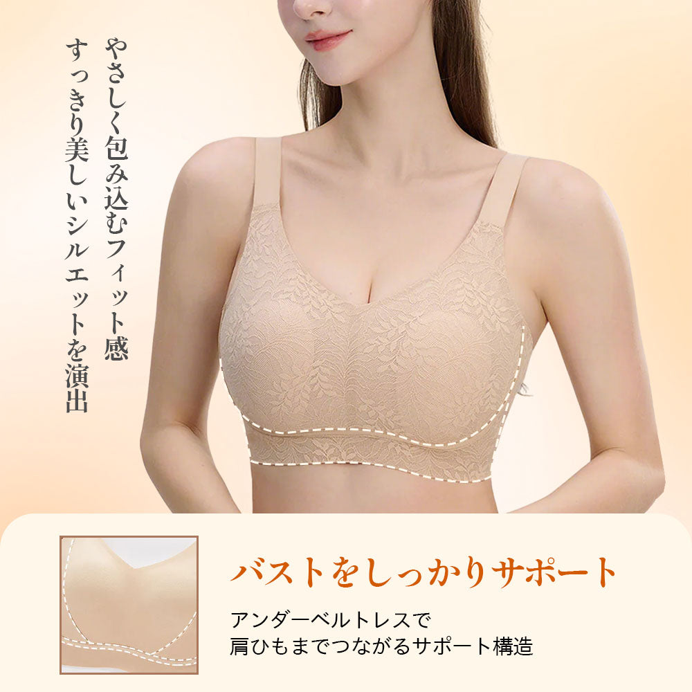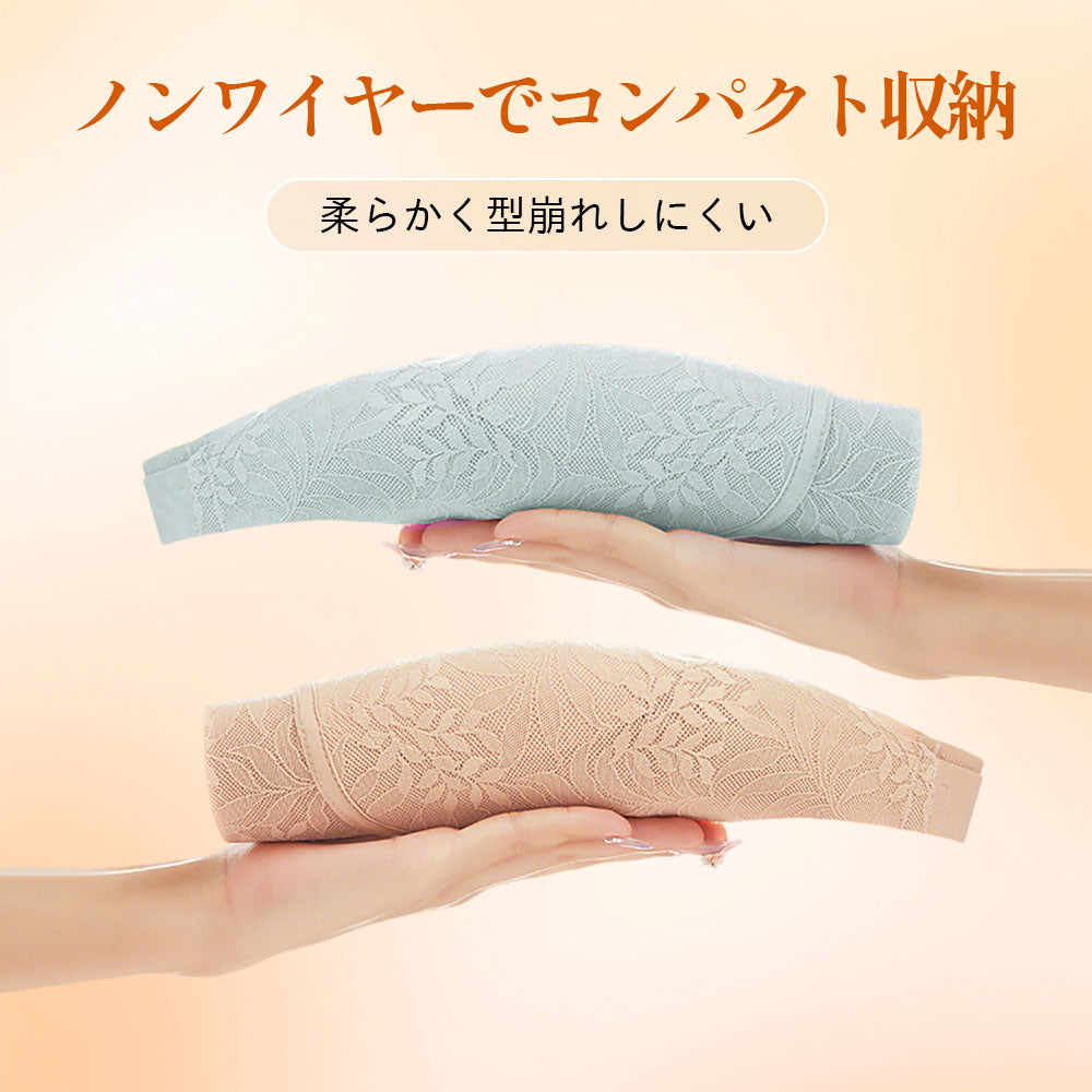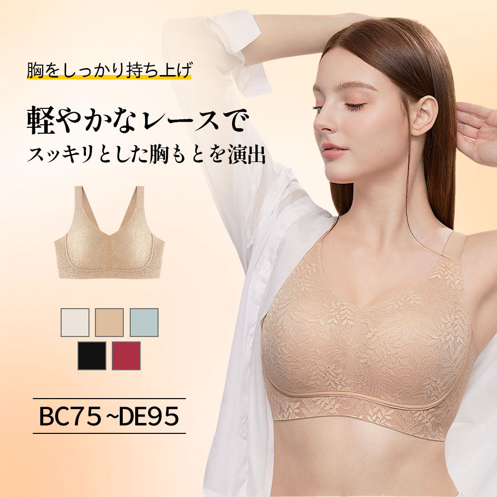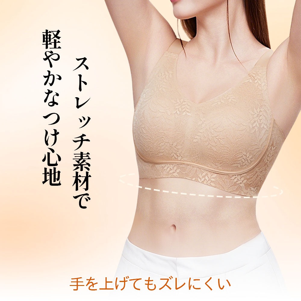 商品詳細:軽やかなレースでバストをやさしく包み込み、自然にリフトしながらすっきりとした印象に。ノンワイヤー設計で締め付け感を抑え、長時間でも快適な着け心地を実現。アウターにひびきにくく、胸を小さく見せたい方におすすめのブラです。